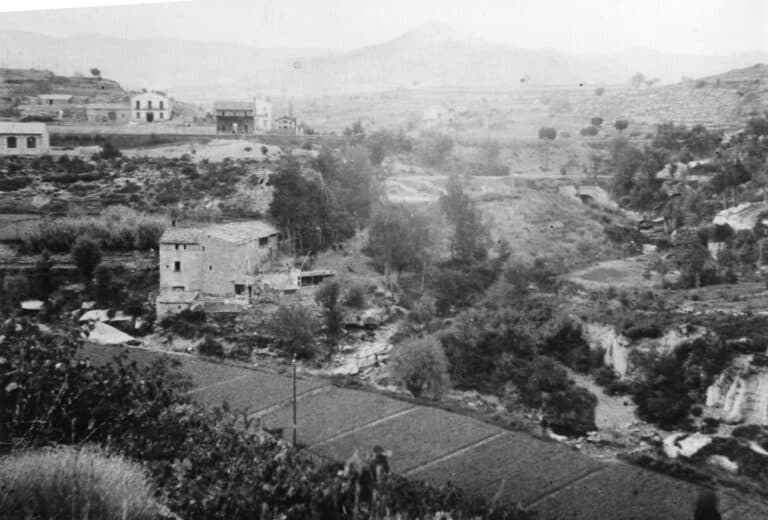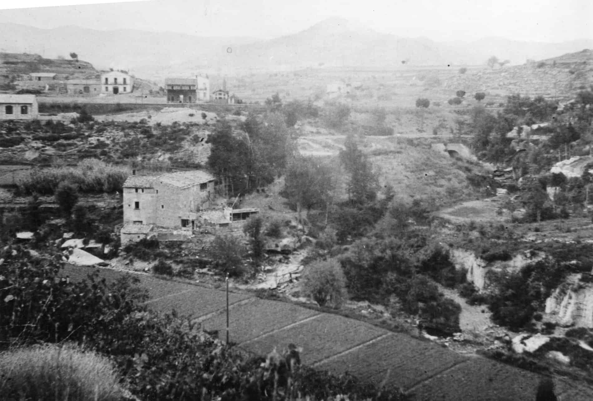 Barri de l’estació als anys 20. L’estació, Ca l’Esteve (ara Mariano), el Molí Nou de Cal Vila i la Serradora, possiblement la fàbrica “Hijos de Francisco Comallonga”, Cal Camalligat i darrere l’estació potser Cal Vers?