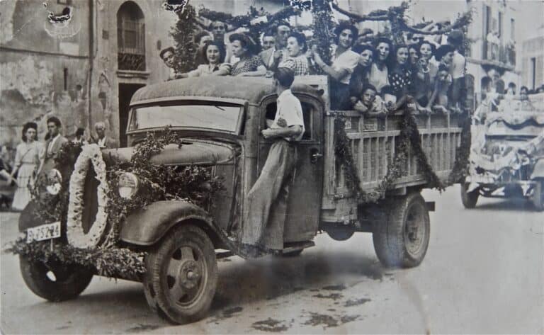 Camió que conduïa el Nasi de cal Putxó, probablement al Passeig de Manresa durant la benedicció de vehicles per St. Cristòfol. Entre la colla que anava a la caixa del camió hi ha la Lurdes de cal Masfred de Rajadell, nòvia del xofer, i una seva parenta.