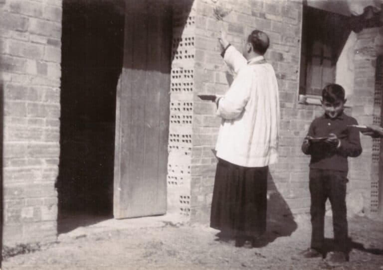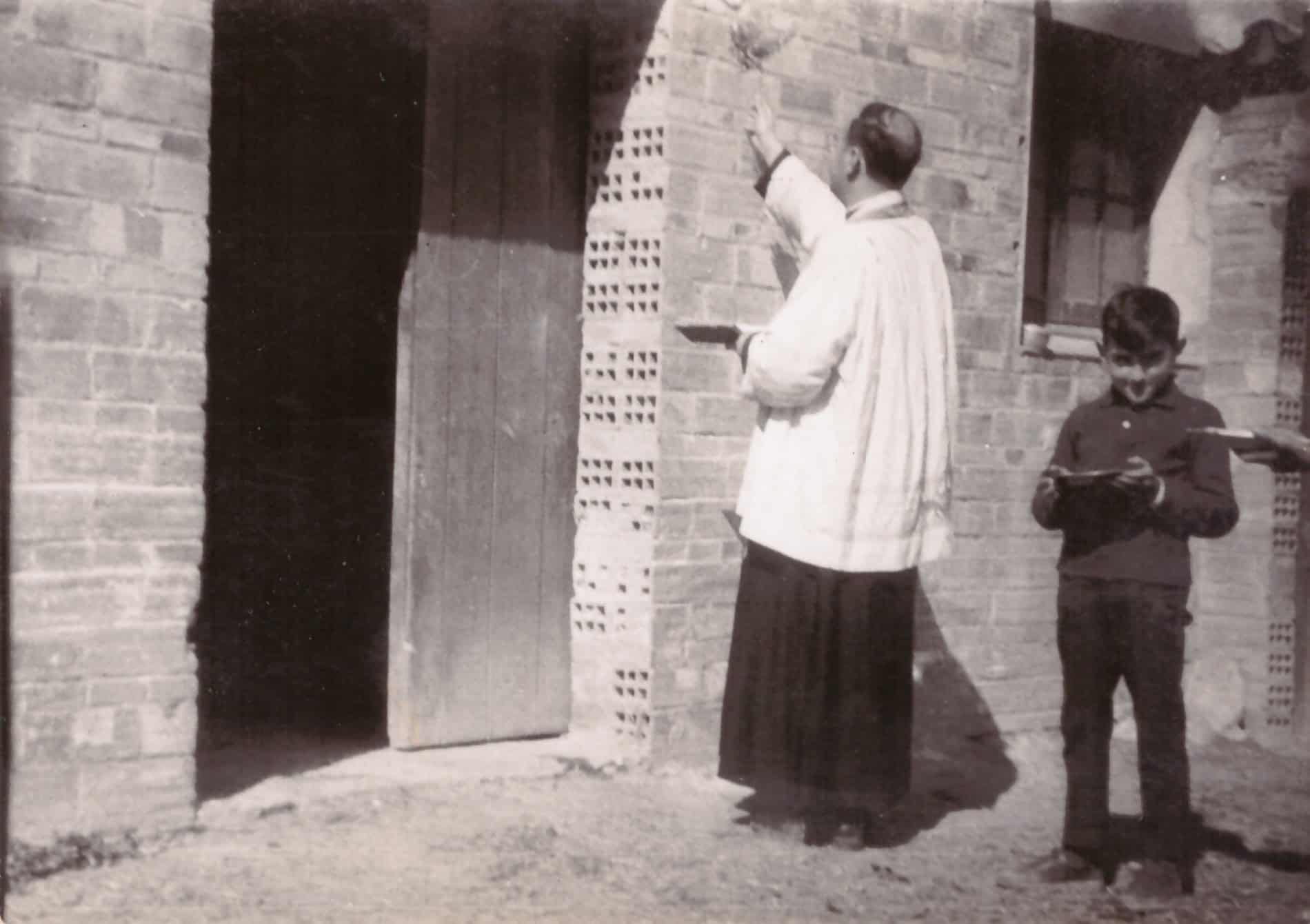 Mossèn Antoni fent el Salpàs a la porta del cobert dels porcs. Baltasar Feixas Camps.