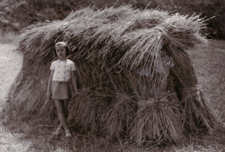 Mercè Soldevila Botines davant d’un pilot de garbes apilades (garbera) al camp de dalt de la serra de Castelltallat. Les garbes estan lligades amb els vencills.