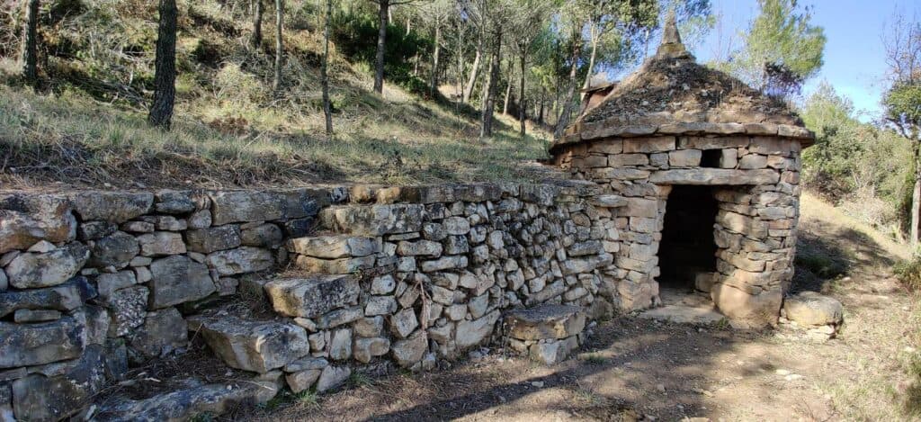 El propietari del mas Vilalta, que és un paleta dels d’abans, fa uns anys va rehabilitar tres d’aquestes barraques, un treball que va merèixer dos primers premis en el concurs de rehabilitació de barraques i construccions en pedra seca que organitza la D.O. Pla de Bages. Aquí presentem quatre d’aquestes barraques, més una tina, totes elles clarament visibles.